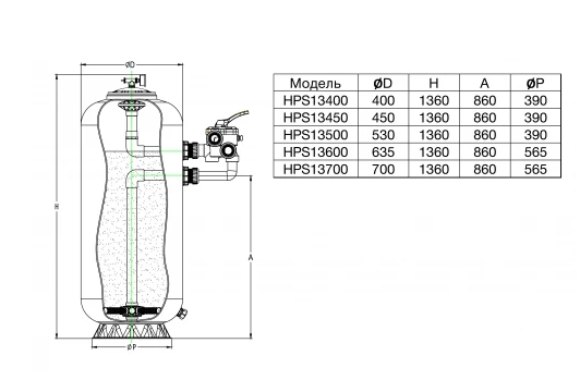 Фильтр HPS13500, шпул. навивки, d.500мм.,7м³/ч, выс загр.0,8м, бок.подкл. 1½", без вентиля